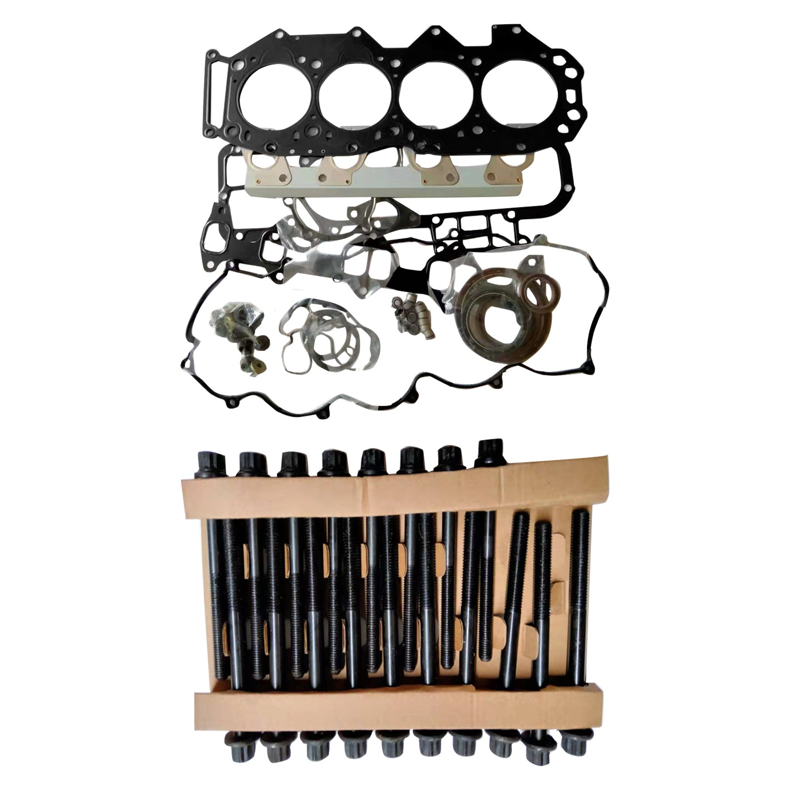 Includes head gasket, manifold gaskets, rocker cover gaskets, valve stem seals, thermostat housing gasket, and other small gaskets and seals.